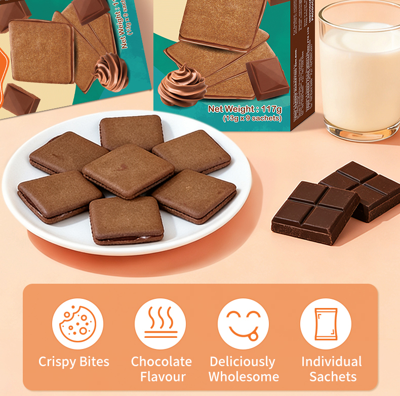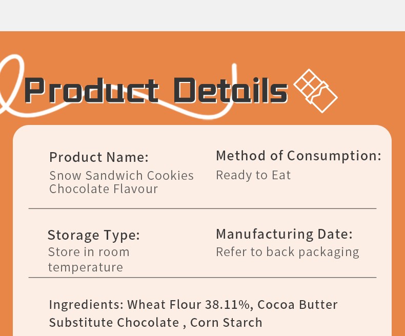 Wheat Flour 38.11%, Cocoa Butter Substitute Chocolate [Contains Whey Powder,Lactose, Lecithin (INS 322), Mono-and Diglycerol Fatty Acid Esters (INS 471), Vanillin, Flavouring] 32.00%, Sugar 11.43%, Vegetable Oil, Butter 3.81%, Cocoa Powder 2.68%, Corn Starch 1.52%, Glucose, Salt, Caramel Colour (INS 150), Sodium Bicarbonate (INS 500)